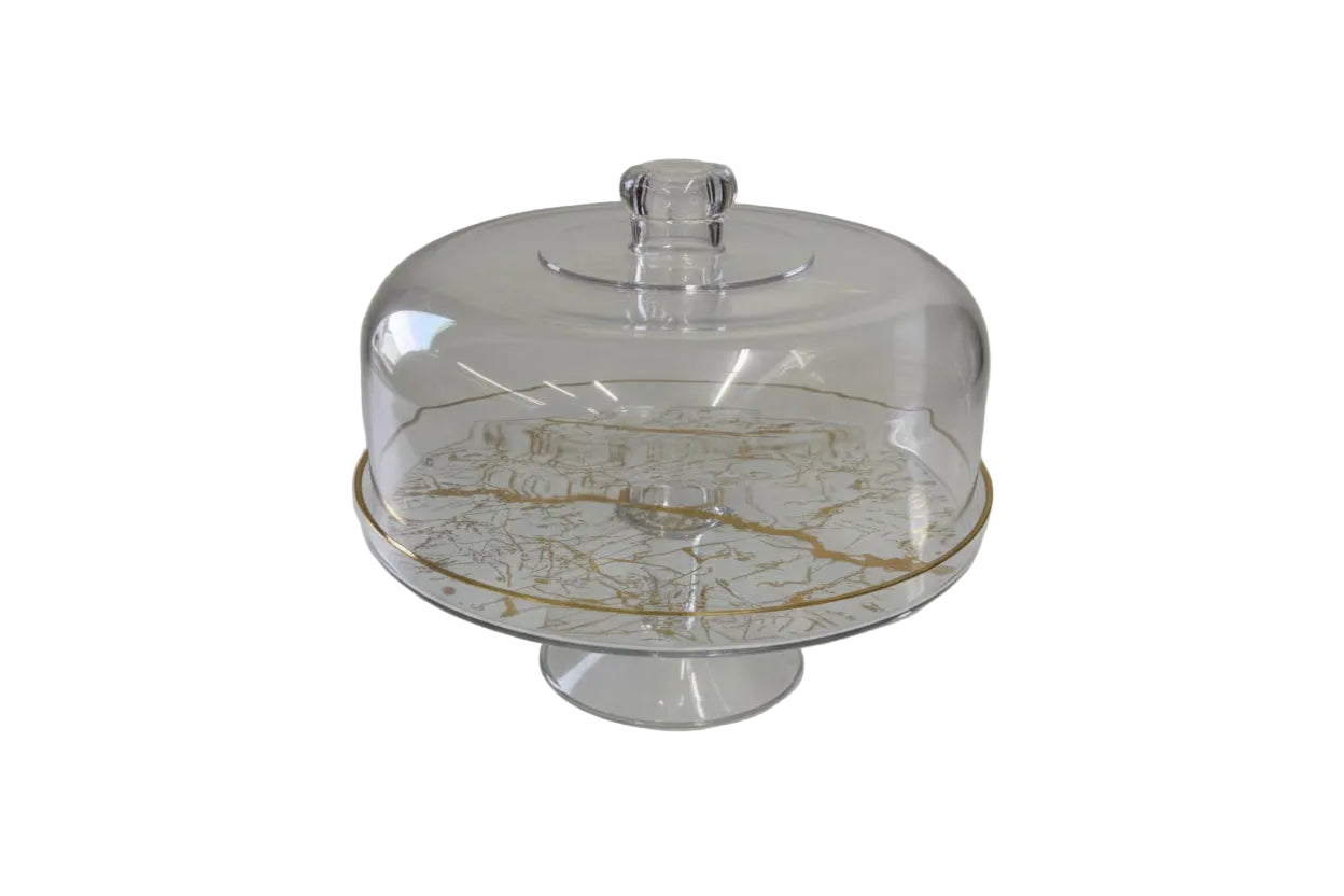 This item is a footed cake tray with a decorative gold-patterned dome, suitable for weddings, parties, or home decor.